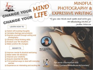 One does not have to be a good photographer to take photos. You also don't have to be a good writer to write. But using photography as a tool to become a better writer will not only sharpen your photography skills but it will also improve your writing skills. As you learn how to become a better writer you can use it as a therapeutic activity to visualize and verbalize your emotions, moods and feelings. This course teaches you how photography can be used in everyday scenarios in order for you to find a starting point to change your thoughts, your perspective and ultimately create a better life by being in control of your emotions and actions through expressive writing.