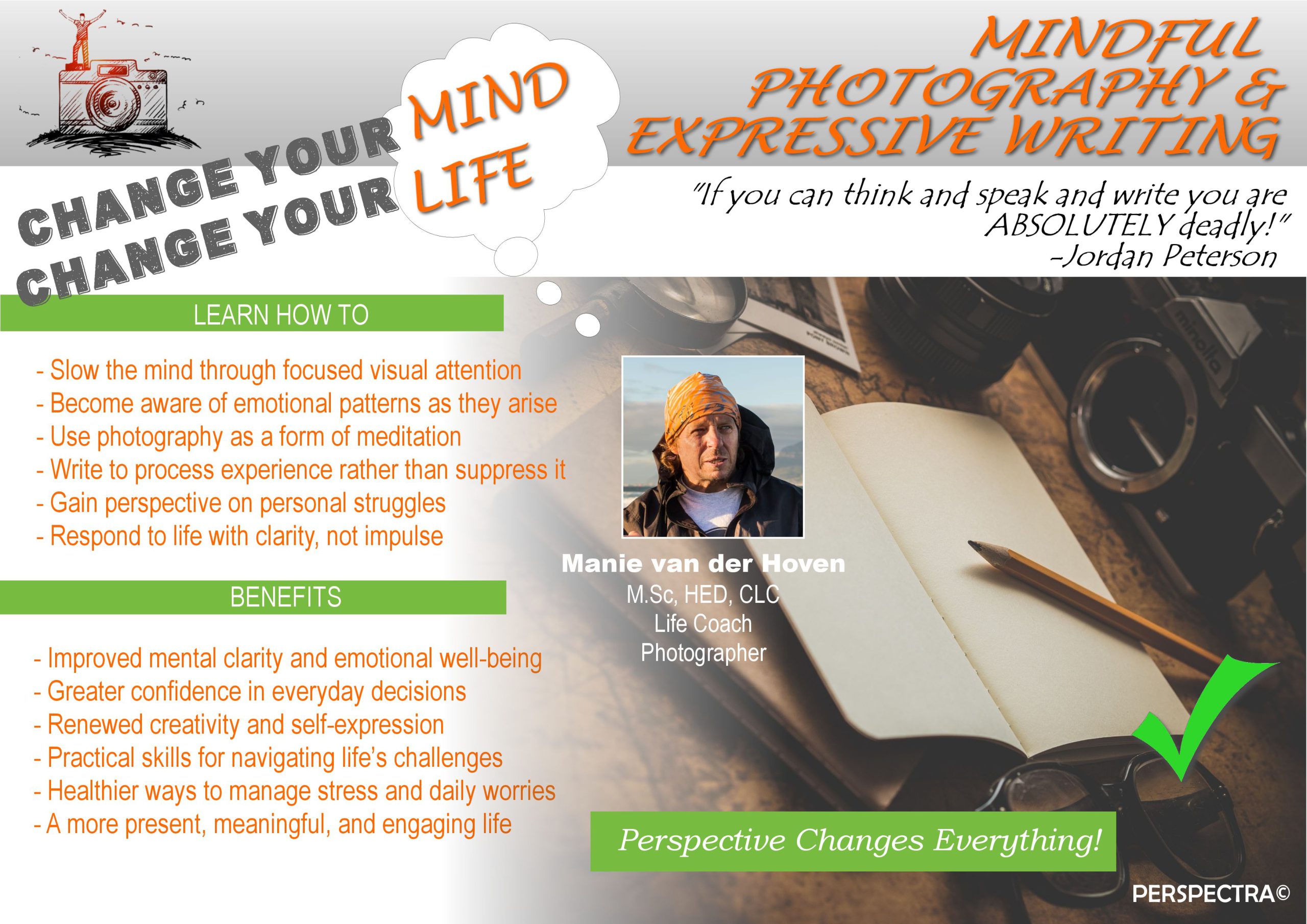 This course uses mindful photography as a starting point for expressive writing and self-reflection. Through guided prompts and gentle structure, photographs become doorways into thoughts, emotions, and insights that are often difficult to access directly.
